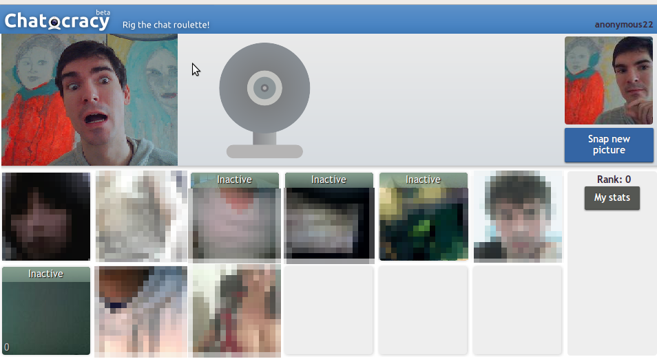 Chatocracy is a website that allows people to have one to one conversations on the webcam. After each conversation you can rate the person you have been talking to ; the better ranking you get, the more people you can talk to.My brother and me have been working on this website for the last few weeks. It is still beta so if you encounter problems please report it.